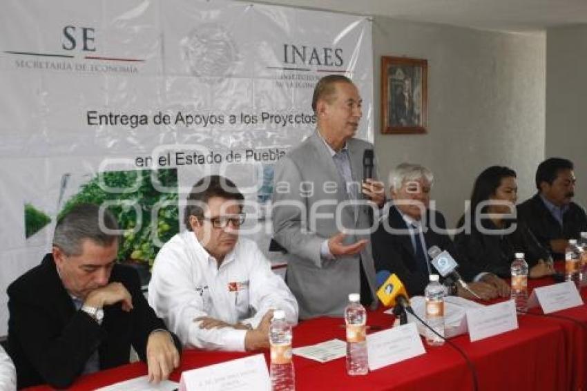 PUEBLA, Pue. 22 octubre 2014.- Jorge Arroyo García, representante federal en el estado de Puebla del Instituto Nacional de Economía Social (Inaes) y delegados federales, durante la “Entrega de Recursos a Empresas Sociales y Sociedades Cooperativas”. //Francisco Guasco//Agencia Enfoque//