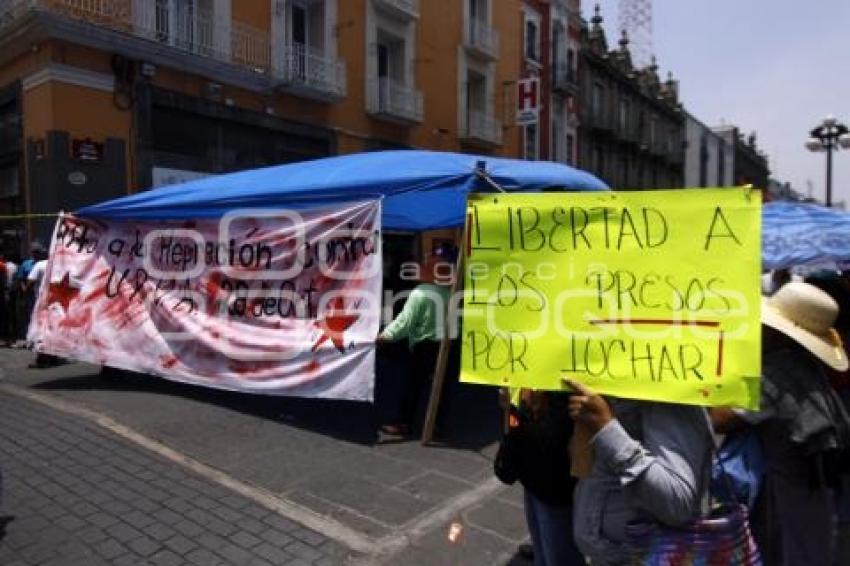 PUEBLA, Pue, 21 Mayo 2015.- Integrantes de la 28 de octubre mantienen plantón en la esquina de la 3 norte y Reforma, mismas que se encuentran cerradas por elementos de la policía municipal. //Hilda Ríos/Agencia Enfoque//