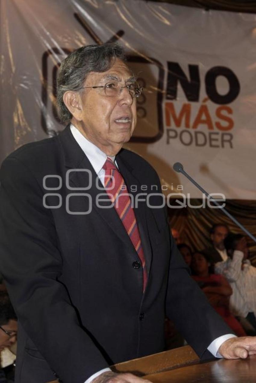 PUEBLA, Pue. 09 Mayo 2014.- El político mexicano Cuauhtémoc Cárdenas y el senador Javier Corral, acudieron a la asamblea constitutiva del frente por la comunicación democrática en el teatro de la ciudad. //Hilda Ríos/Agencia Enfoque//