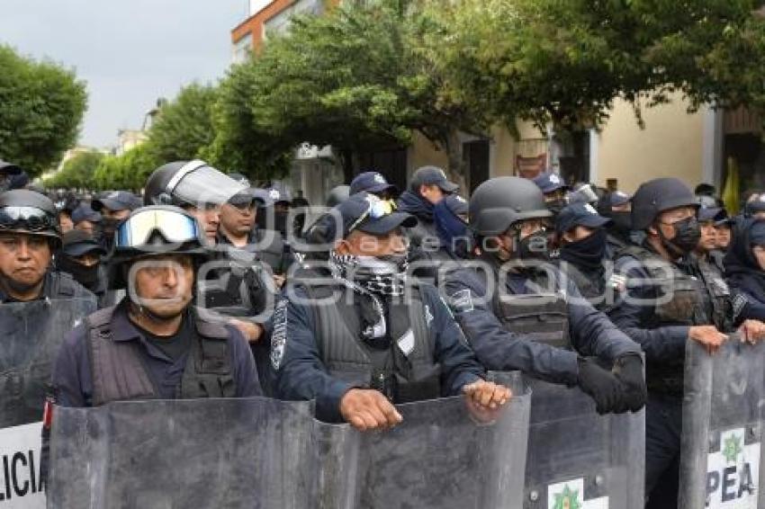 TLAXCALA, Tlax. 02 Agosto 2023.- Policías resguardan las inmediaciones de la Secretaría de Cultura federal donde maestros y miembros de diversos sindicatos se manifestaron, evento donde se encontraba la gobernadora del estado de Tlaxcala. //Liz Romero/Agencia Enfoque//