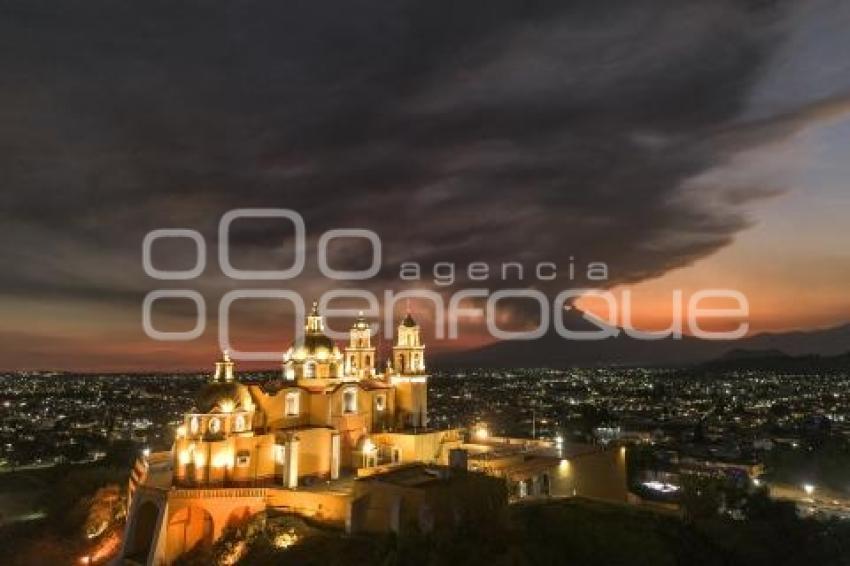 PUEBLA, Pue. 2 Marzo 2024.- Así se apreció desde dron, el atardecer sobre el volcán Popocatépetl, con el templo de la Virgen de los Remedios formando parte de la postal. //Oscar Rodríguez/Agencia Enfoque//