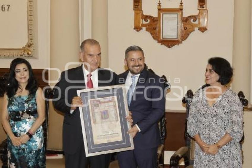 PUEBLA, Pue. 22 Mayo 2024.- El edil de Puebla, Adán Domínguez Sánchez entregó la Cédula Real y Real Provisión a los empresarios poblanos Beatriz Camacho, Olga Méndez Juárez, Gilberto Marín y Arnoldo de la Rocha, en el palacio municipal. //Oscar Rodríguez/Agencia Enfoque//