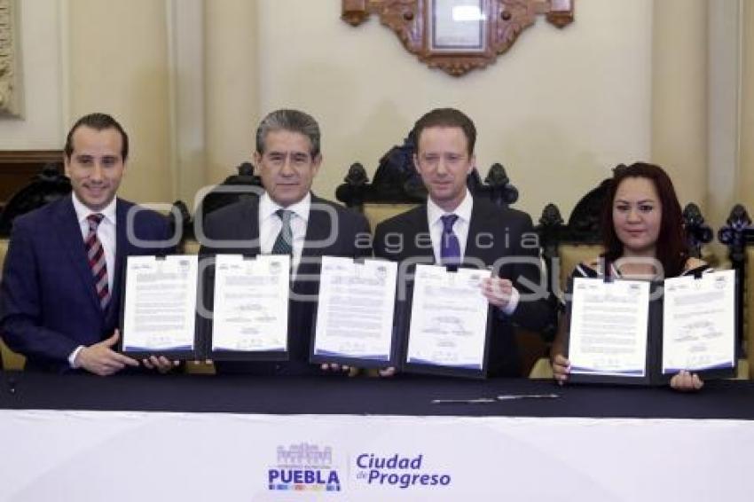 PUEBLA, Pue 12 abril 2017. El alcalde Luis Banck acompañado por Diódoro Carrasco; secretario general de gobierno, realizaron la firma de convenio y develación del cuadro 5 de Mayo en la sede del palacio municipal. /Hilda Ríos/Agencia Enfoque//