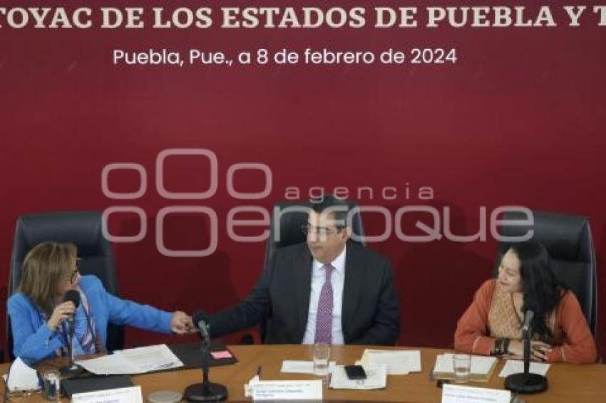 PUEBLA, Pue. 8 Febrero 2024.- Encabezan la gobernadora de Tlaxcala, Lorena Cuéllar Cisneros; el gobernador de Puebla, Sergio Salomón Céspedes Peregrina y la Secretaria del Medio Ambiente, María Luisa Albores González la instalación del Comité de Ordenamiento Ecológico de la Región de la Subcuenca del Alto Atoyac de los Estados de Puebla y Tlaxcala. //Rafael Pacheco/Agencia Enfoque//