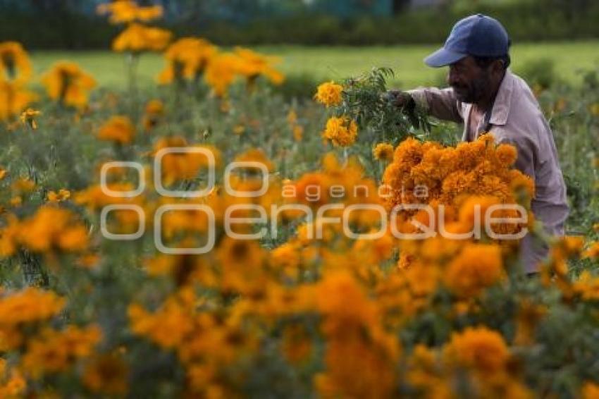 SAN ANDRÉS CHOLULA, Pue. 01 noviembre 2015.- Campesinos de San Andrés Cholula, realizan la corta de flor de cempasúchil o flor de muerto a los pies de la zona pirámide de Cholula. Dicha flor es conocida sobre todo por ser uno de los adornos más populares en las tumbas y ofrendas de Día de Muertos, la "flor de veinte pétalos" (por sus raíces en lengua náhuatl cempoal-xochitl, veinte-flor). //Francisco Guasco/Agencia Enfoque//