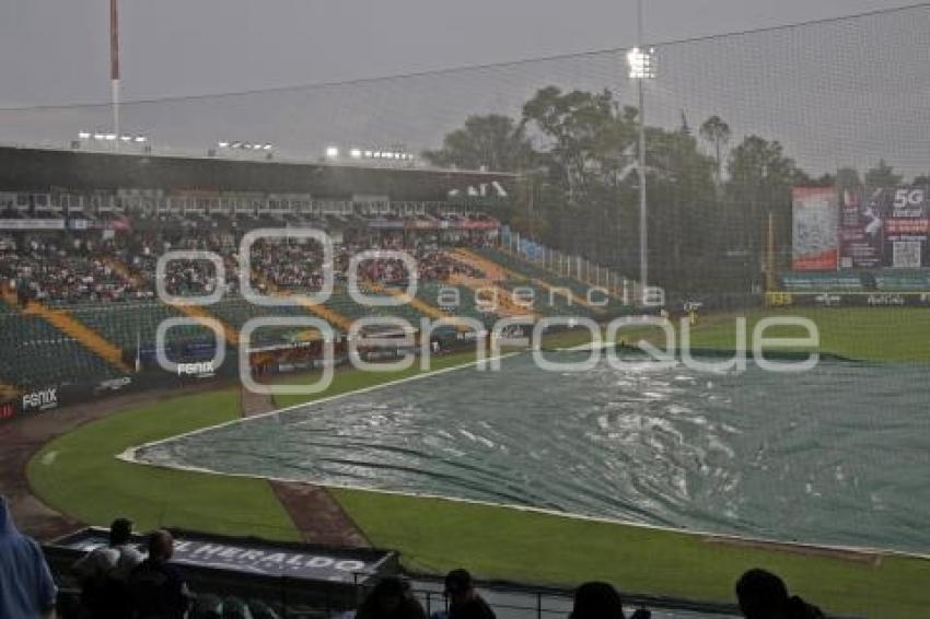 ESTADIO DE BÉISBOL . GRANIZADA PUEBLA, Pue. 12 Agosto 2023.- Se cubre de blanco el estadio de béisbol Hermanos Serdán debido al granizo que cae en la zona norte de la ciudad. //Mara González//Agencia Enfoque// Agregar a Carrito Comprar