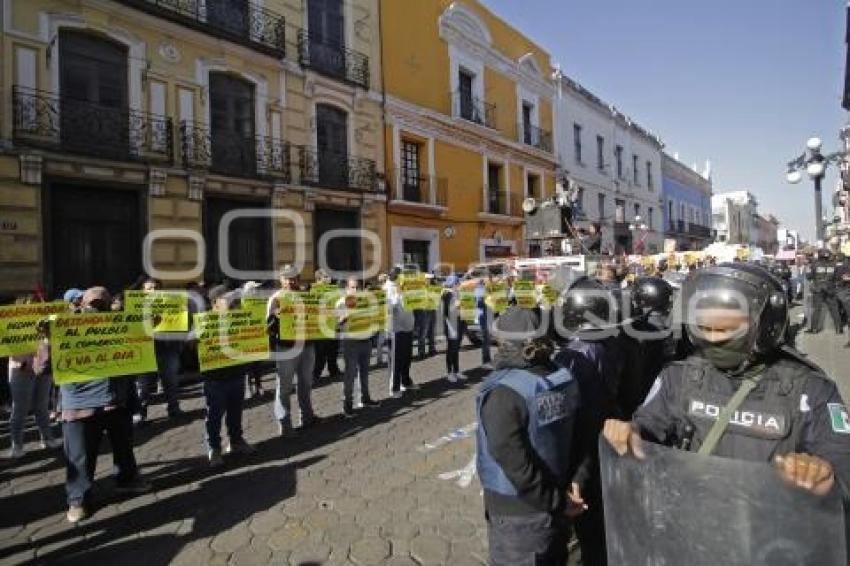 PUEBLA, Pue. 03 Febrero 2023.- Integrantes de Antorcha Campesina protestan en contra de la verificación vehicular frente al Congreso del Estado, donde se observan granaderos de la Policía Estatal custodiando el inmueble. //Mara González/Agencia Enfoque//