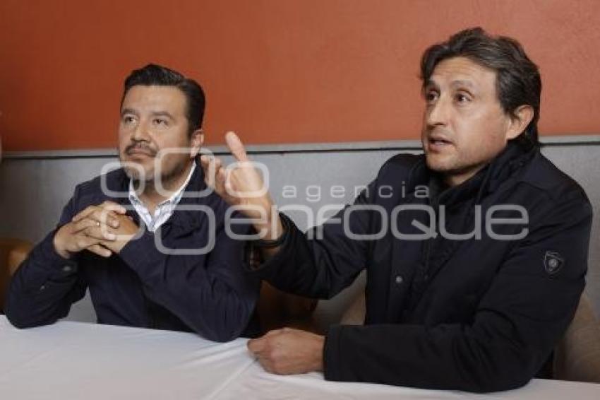 PUEBLA, Pue. 1 Febrero 2024.- El presidente del Comité Municipal del PAN, Jesús Salvador Zaldívar Benavides y el aspirante a la diputación federal, José Juan Espinosa Torres durante una rueda de prensa. //Oscar Rodríguez/Agencia Enfoque//