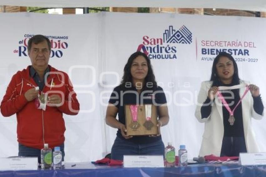 SAN ANDRÉS CHOLULA, Pue. 12 Junio 2025.- Presentan la presidenta de San Andrés Cholula, Guadalupe Cuautle, y el presidente de J&J Sports, Javier Castellanos, la medalla y playera de la quinta edición del Medio Maratón del Día del Padre, que se llevará a cabo el domingo 15 de junio, con salida y meta en el deportivo Quetzalcóatl. //Rafael Pacheco/Agencia Enfoque//